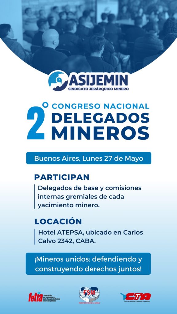 Asimismo, nos preparamos para desarrollar el Segundo Congreso Nacional de Delegados Mineros de ASIJEMIN, el cual se llevará a cabo en la ciudad de Buenos Aires el lunes 27 de mayo. Unos 50 trabajadores de cada yacimiento minero de San Juan y Santa Cruz participarán en jornadas de trabajo, planificación y acciones destinadas a continuar defendiendo y promoviendo nuevos derechos laborales para los trabajadores mineros de Argentina.