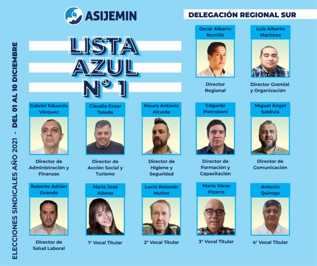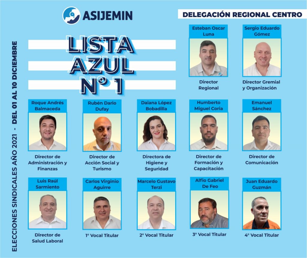Acompañan la Lista Azul Nº 1: director Regional, Esteban Oscar Luna; director Gremial y Organización, Sergio Gómez; director de Administración y Finanzas, Roque Balmaceda; director de Acción Social y Turismo, Rubén Dufay; directora de Higiene y Seguridad, Daiana Bobadilla; director de Formación y Capacitación, Humberto Coria; director de Comunicación, Emanuel Sánchez; director de Salud Laboral; Luis Sarmiento; 1° Vocal Titular; Carlos Aguirre; 2° Vocal Titular: Marcelo Terzi; 3° Vocal Titular; Alfio Gabriel De Feo y 4° Vocal Titular, Juan Guzmán.