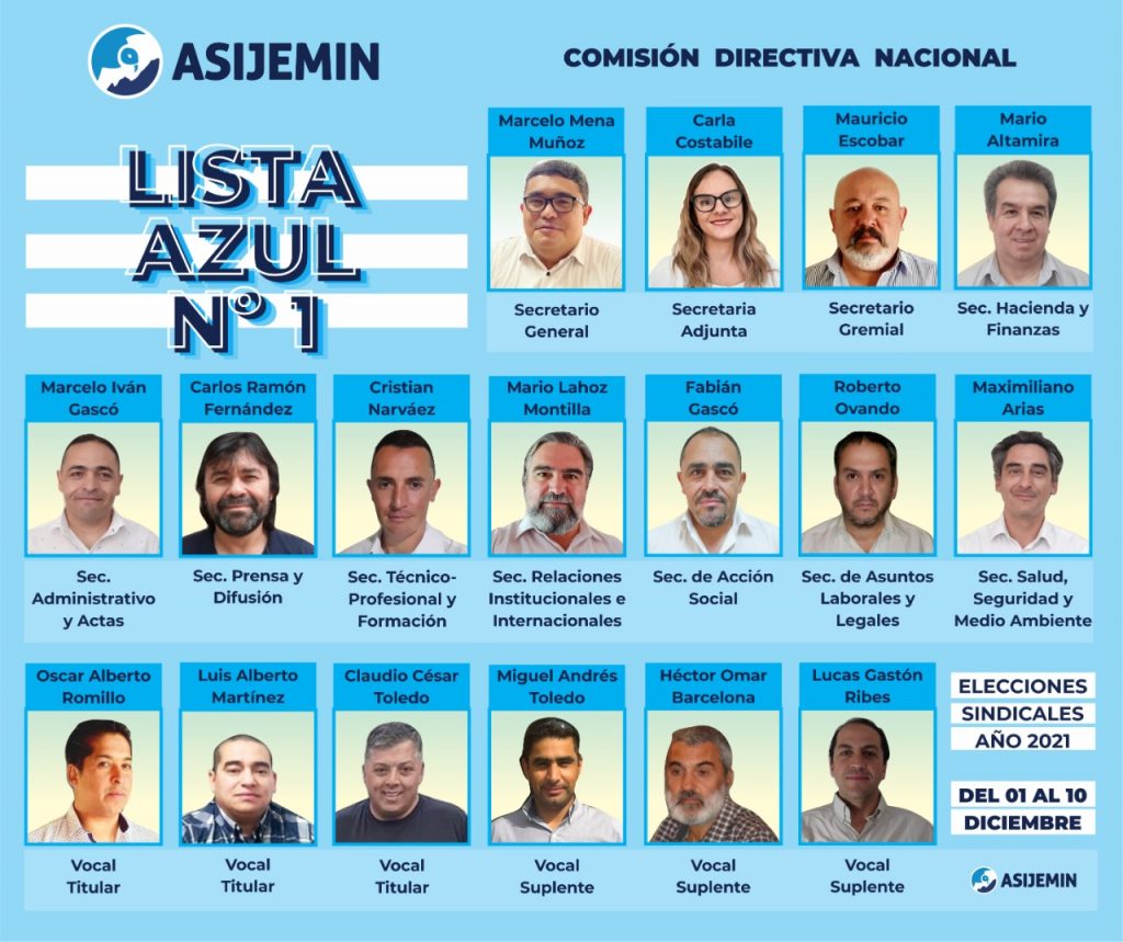 Para la elección nacional fue oficializada la Lista Azul Nº 1, que está encabezada por el candidato a secretario General Marcelo Mena Muñoz ; Carla Costabile, secretaria Adjunta; Mauricio Escobar, secretario Gremial; Carlos Fernández, secretario de Prensa y Difusión; Mario Altamira, secretario de Hacienda y Finanzas; Fabian Gasco, secretario de Acción Social; Cristian Narváez; Secretario Técnico-Profesional y Formación; Roberto Ovando, secretario de Asuntos Laborales y Legales; Maximiliano Arias, secretario de Salud, Seguridad y Medio Ambiente; Mario Lahoz, secretario de Relaciones Institucionales e Internacionales y Marcelo Iván Gascó, secretario Administrativo y Actas.