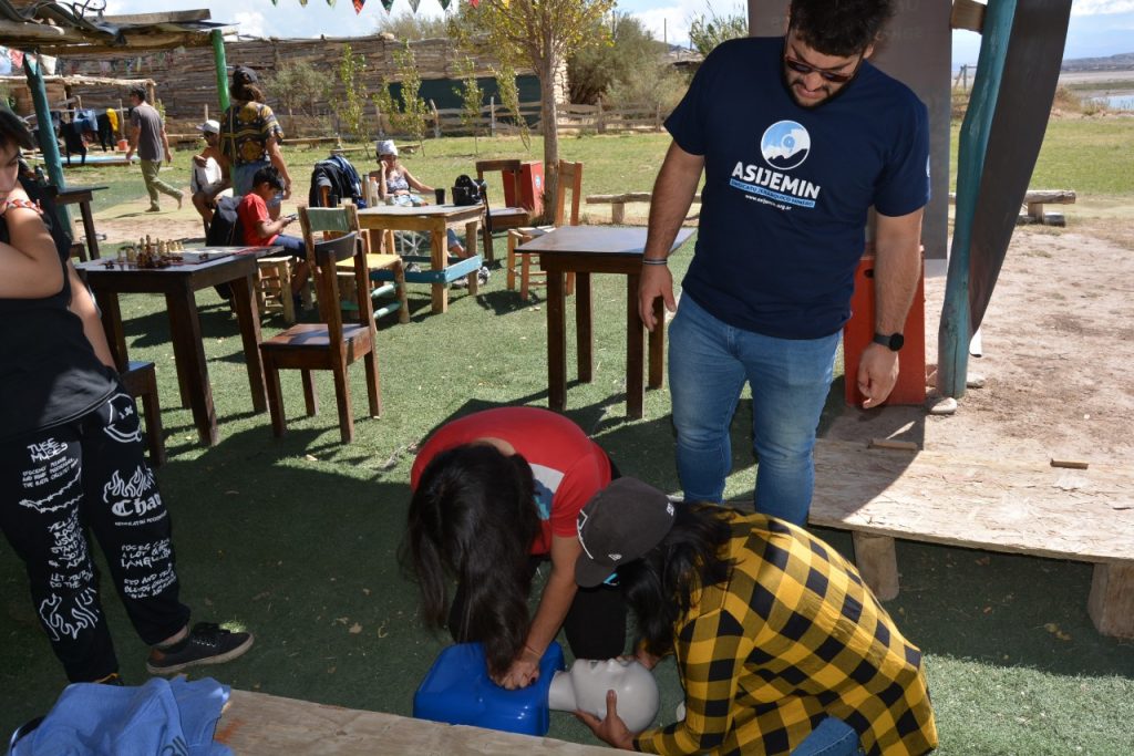 Con la participación de los instructores, Gabriel Vega y Santiago Altamira, las clases se desarrollaron en la Playa Todo Viento, y consistió en brindar información teórica y talleres de aprendizaje en RCP y socorrismo, en el marco de proyectos de capacitación de la industria minera que desarrollan en conjunto FUDEFOMI y ASIJEMIN en diversas instituciones de la provincia.